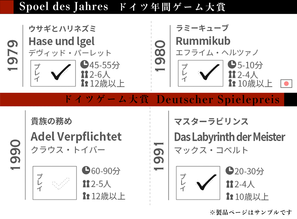 ドイツのボードゲーム賞「ドイツ年間ゲーム大賞(Spiel des Jahres)」「ドイツゲーム大賞(Deutscher Spielepreis)」の大賞獲得作品を一覧で掲載。遊んだゲームにチェックをすることで、今年どの大賞ゲームで遊んだのかが分かります。また、日本語版が出版されているゲームには日本国旗をマークしているので、ぜひお役立てください!