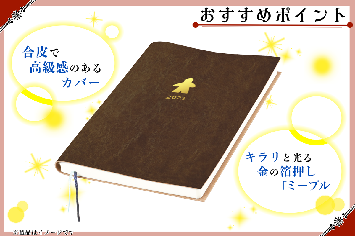 シンプルで高級感のある合皮カバーに、箔押しされたミープルがキラリと光ります。さり気なくボドゲ好きをアピールすることができるので、同好の士を探すこともできるでしょう。カバー色は男女問わず使いやすい、そしてボードゲームと並べた時の相性がいい(?)ダークブラウンをセレクトしました。