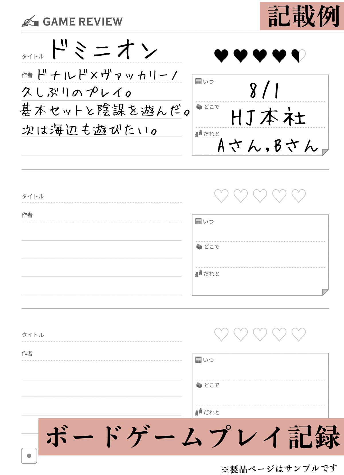 遊んだボードゲームを記録できるページをご用意しました。遊んだ人や遊んだ日、場所なども併せてメモができます。自分の評価を書きとめることで、後日その記録を振り返って楽しむことも可能です。