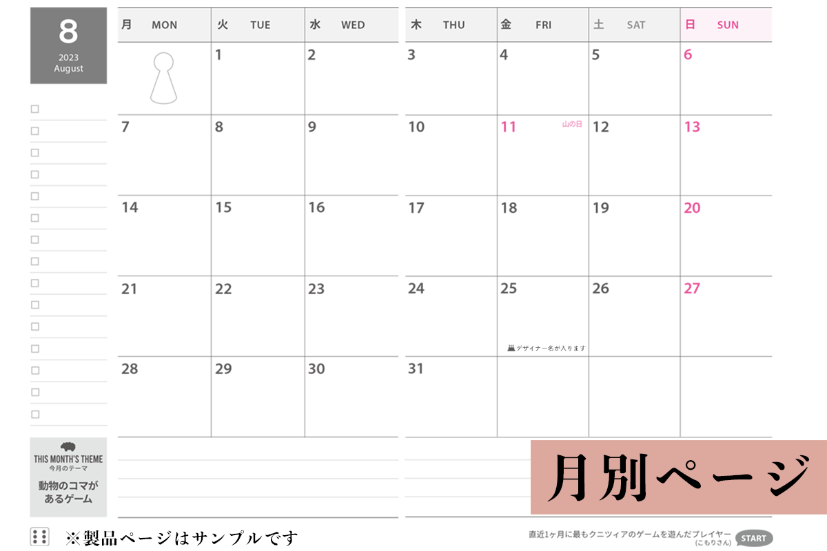 スケジュール帳としての機能はもちろん、ボードゲーマーにとって日々が少しだけ楽しくなるようなアイディアを詰め込んでいます。