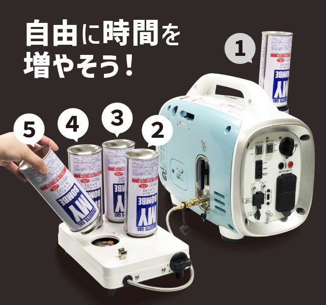 発電機「クレマ」にセットできるカセットボンベは通常1本ですが、発電機専用の外付けユニット「BB-401」を使えば最大5本に増やせるため長時間もOK!本数は自由に選べるので、使いたい時間に合わせてセットするガス量を調整できちゃいます!