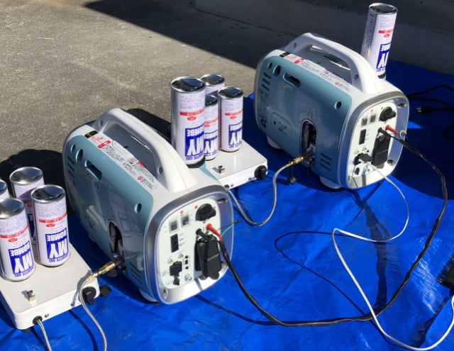 長時間の運転を可能にする専用ボンベユニット「BB-401」。通常時より最大約5倍稼働するので「クレマ」のエンジンを止める頻度が減り、非常時でもより便利に電気を使うことができる最強コンビです。