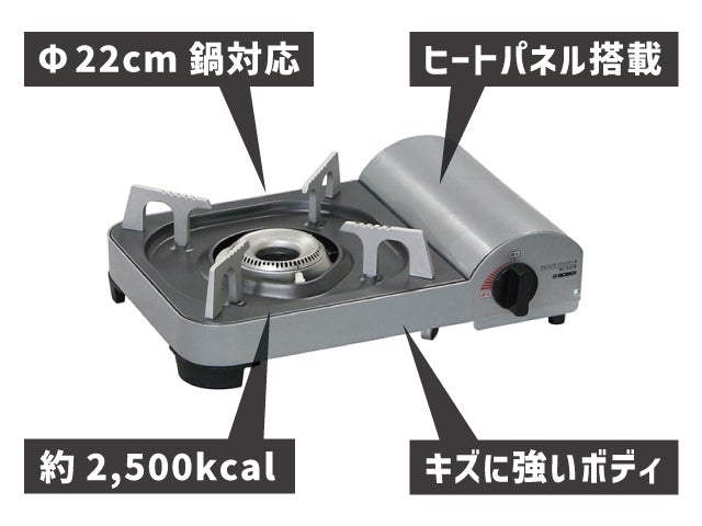 「マイコンロパートナーⅡ」はミドルサイズでありながら火力は約2,500kcalあります。ヒートパネルを搭載することで、貴重なガスを無駄にせず使い切ることができます。直径およそ22㎝までの鍋に対応してので、家族4人の食事を作るには十分役立つカセットコンロです。
