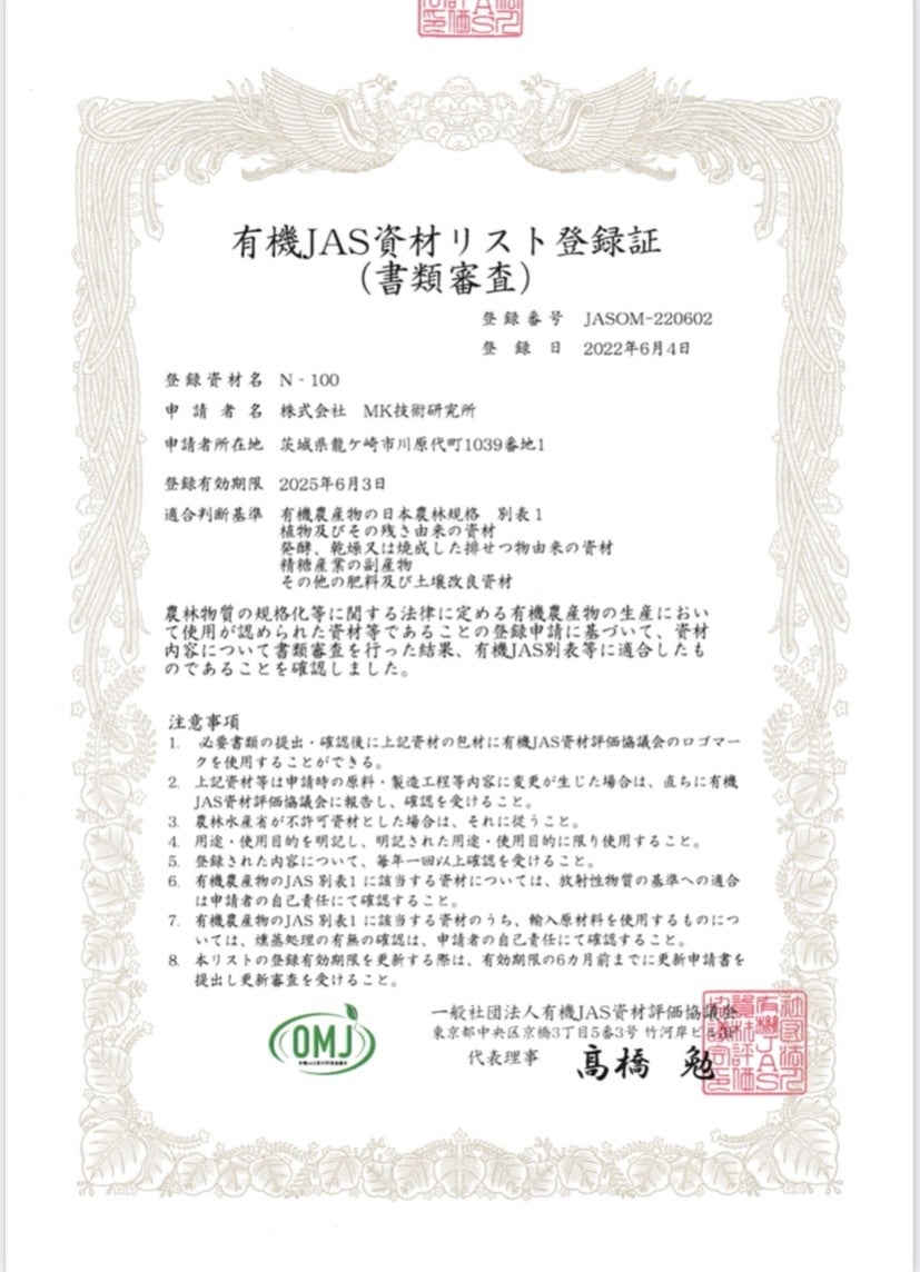 土壌活性液N-100、有機農園N-100、土帰・土輝N-100(どきどき)は農林水産省認定の有機JAS認定商品です。