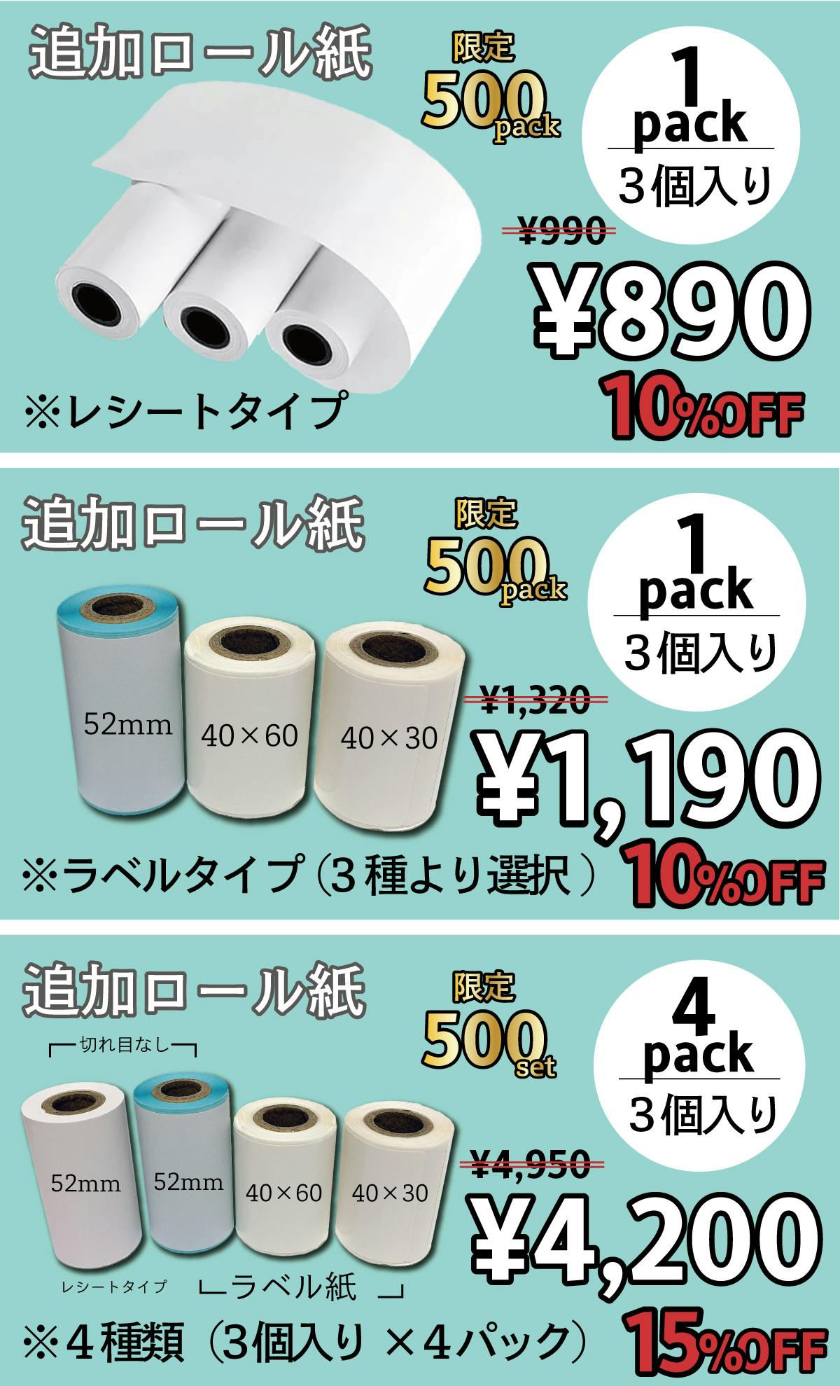 A.本体標準で「レシートタイプ1巻」が付属しております。その他についてはロール紙単体でのリターンをご用意しております。一般販売時にもロール紙のみでのご購入をご用意させていただきます。