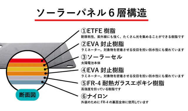 ・パネル材質:単結晶シリコンセル、ETFE、PET、EVA、ナイロン