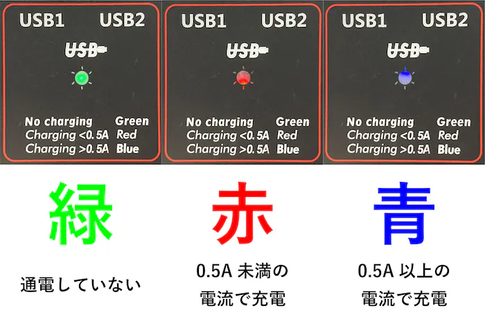 充電レベルを緑・赤・青のランプでお知らせ。
