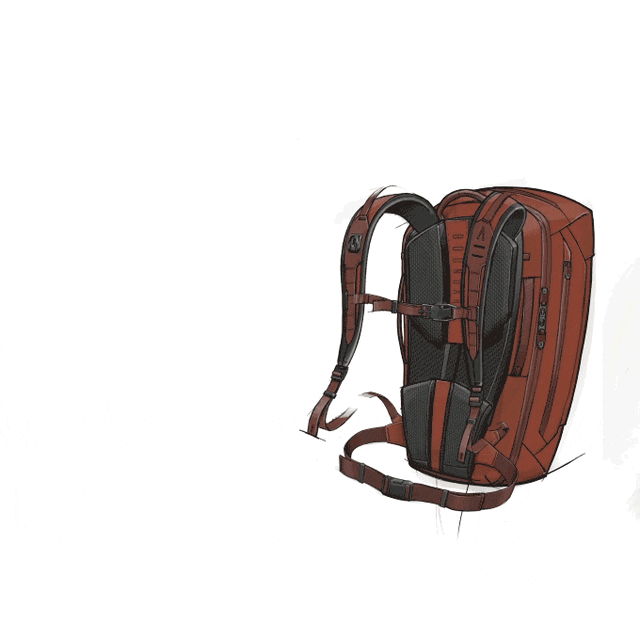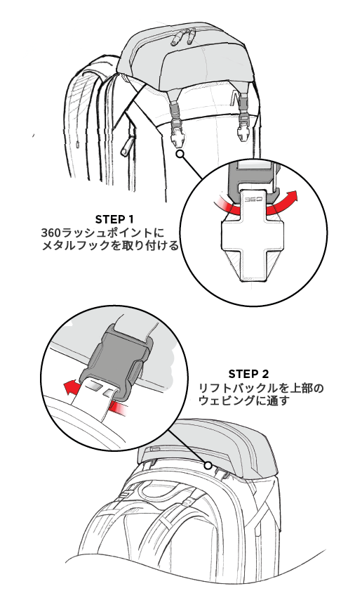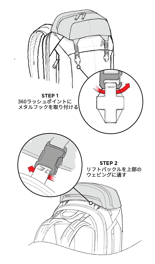 ラッシュストラップを利用すれば、モジュラーコンポーネントなどの追加アイテムをパックの外側に固定できます。