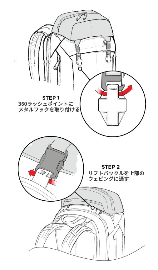 ラッシュストラップを利用すれば、モジュラーコンポーネントなどの追加アイテムをパックの外側に固定できます。