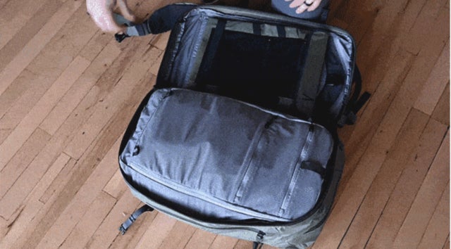 ストラップの中央にある2つのサイドリリースバックルは、メインのストームガードジッパーへの素早いアクセスを可能にします。