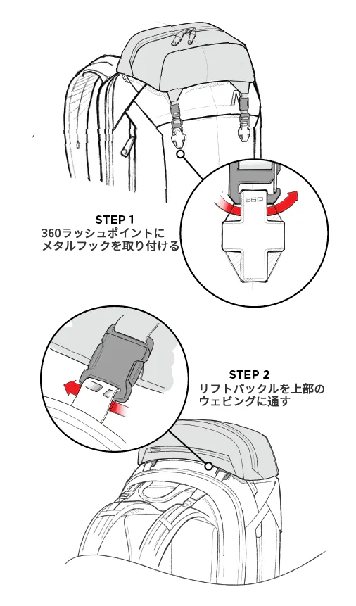 ラッシュストラップを利用すれば、モジュラーコンポーネントなどの追加アイテムをパックの外側に固定できます。