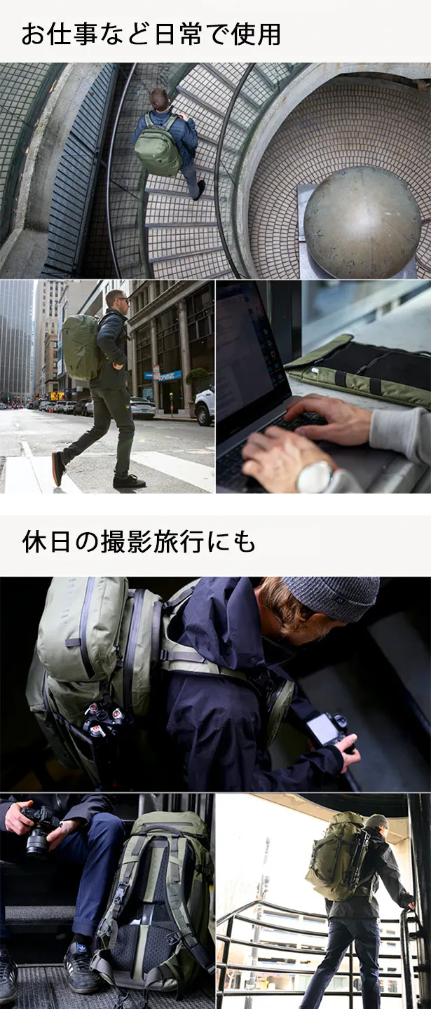 大容量なのに軽く、男女共に背負いやすい調節付き。旅行も本格的な撮影も、アウトドアも出張もお任せ!
