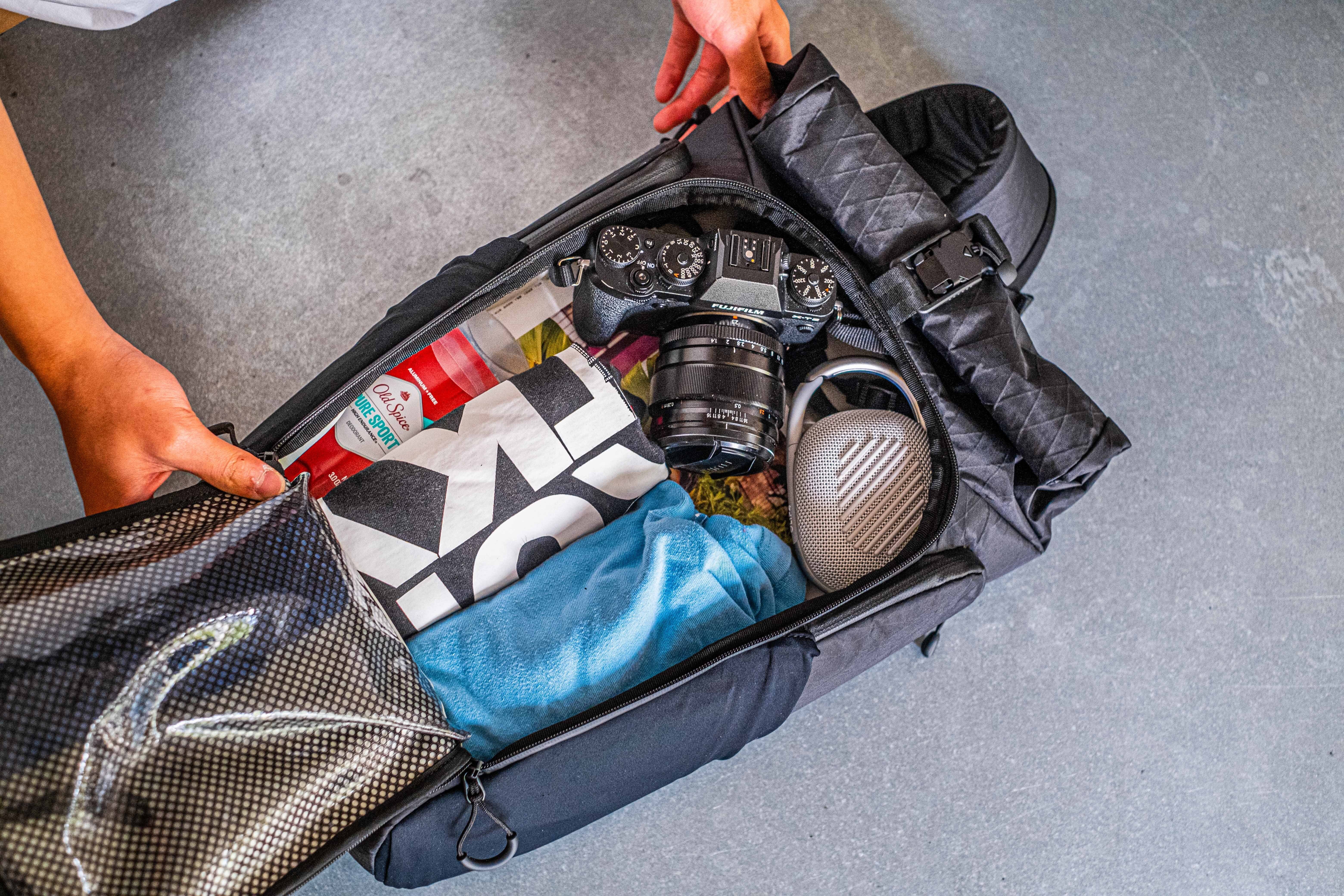 1つは、先ほどご紹介したロールトップから。すぐに取り出したいものは、こちらから収納しておくと便利です。また、雨天でも内部が濡れにくい点もメリットとして挙げられます。