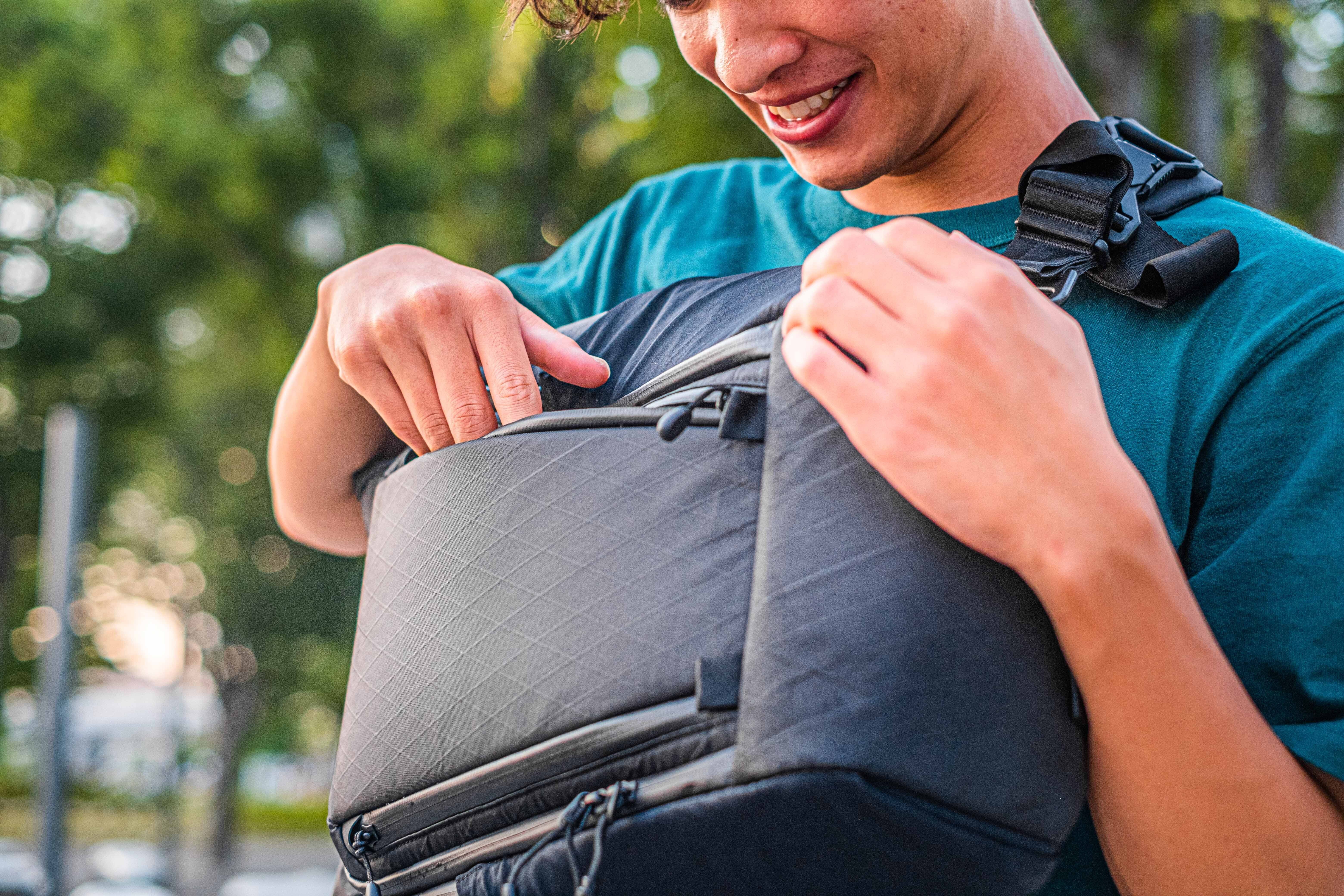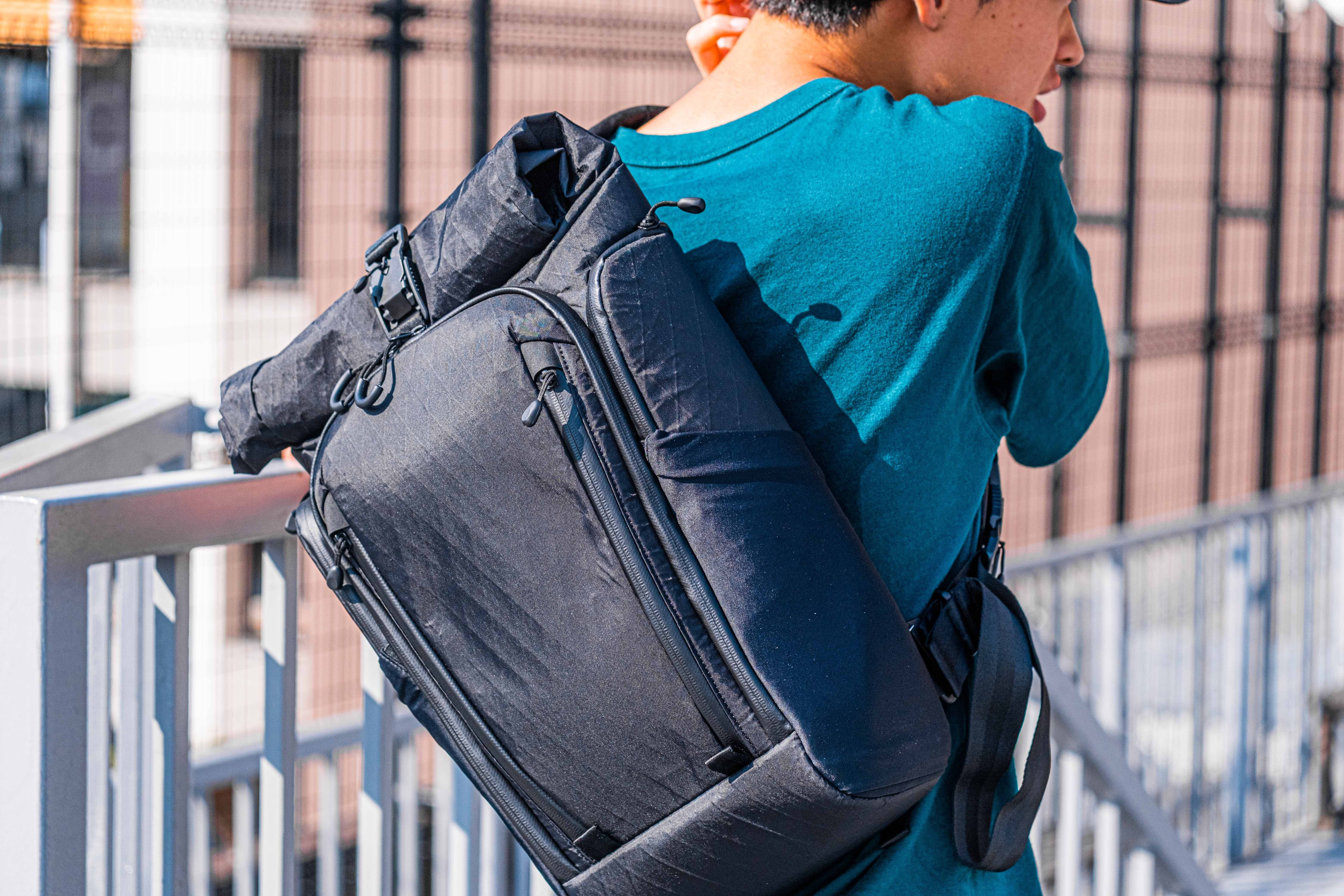 ストラップが片方だけのスリング形状なので、バッグを背中から下ろさず前に移動するのも簡単です。