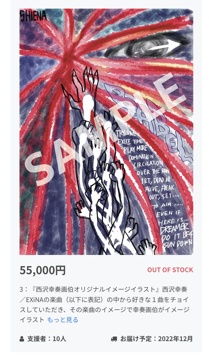 2022/09/08 11:16『西沢幸奏画伯オリジナルイメージイラスト』のリターンが、ありがたいことに「OUT OF STOCK」となりました!心より感謝申し上げます。ありがとうございます!10/8のワンマンライブ以降のスケジュールに「イラスト制作」という項目の日程が確実に増えますね。そして、今週、新たなリターンが追加されます。いったいどんなリターンなのか?是非、ご期待ください。そして、ライブの準備も着々と進んでおります。果たして、ライブの1曲目は何なのか???お楽しみはまだまだ続きます!引き続き、『EXiNA』をお楽しみください。 もっと見る