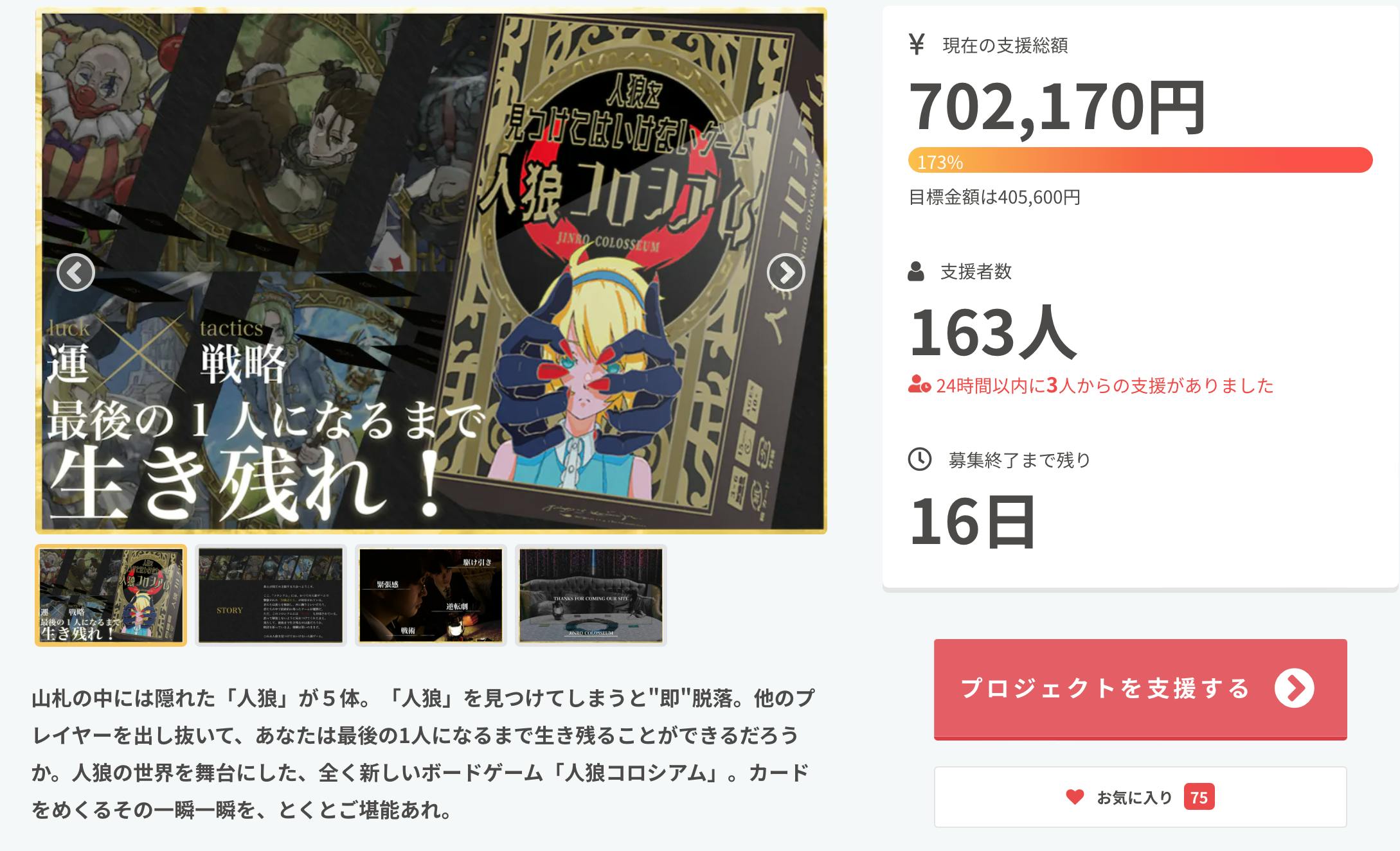 2022/09/21 15:54皆様お世話になっております。ボードゲーム「人狼コロシアム」開発のためのクラウドファンディングを実施しているTRYBE(トライブ)です。プロジェクトを開始して約2週間が経過しました。現在163名の方にご支援いただき、支援金額は70万円を超えました。日頃からの温かいご支援ご協力誠にありがとうございます。プロジェクト終了まで残り半月となりましたが、最後まで走り抜けていきます。人狼コロシアムのTwitterアカウント等でも、日々情報発信しておりますので、フォローよろしくお願いいたします!BASEのサイトで、しばらくの期間販売していなかったあの商品も販売するとのこと。。。。 もっと見る