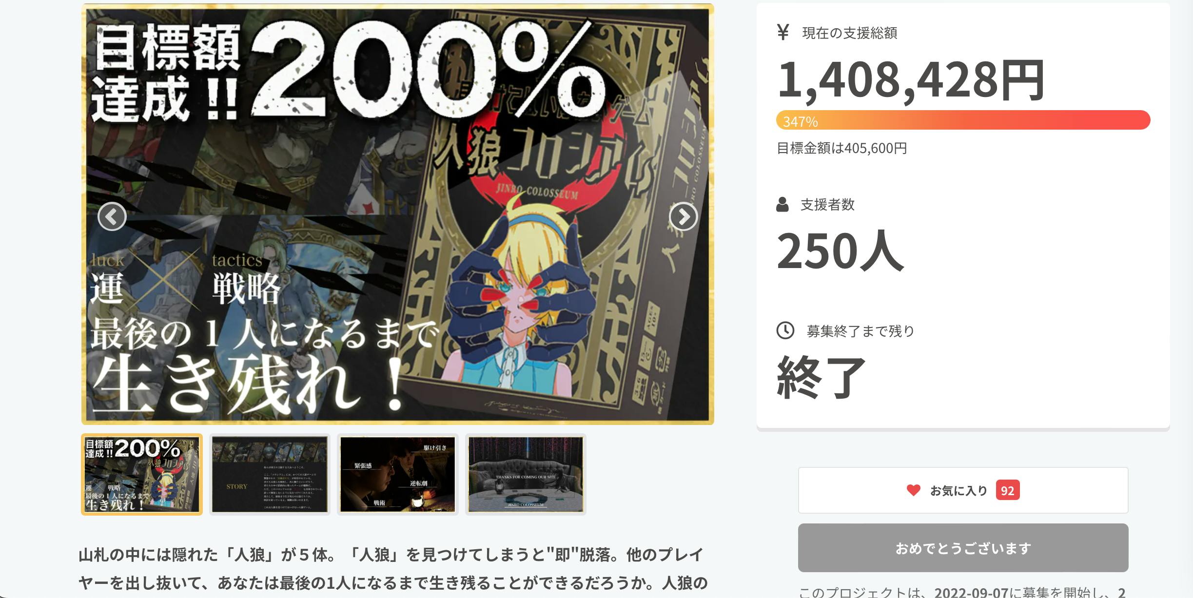 2022/10/09 20:00皆様お世話になっております。ボードゲーム「人狼コロシアム」開発のためのクラウドファンディングを実施していましたTRYBE(トライブ)です。この度は、クラウドファンディングの応援やご支援していただき、誠にありがとうございました。250人という、とても多くの方々にご支援いただき、支援総額1,408,428円を達成いたしましたので、ここにご報告させていただきます!今現在、リターン品の製作・製造に取り掛かっております。みなさまのもとに届けることができるように準備していますので、もう少々お待ちください!(※メールなどで詳細を送る方々もいますので、メールが届きましたらチェックをお願いいたします!)取り急ぎご報告とさせていただきます。TRYBE もっと見る