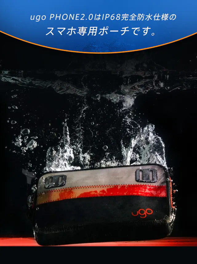 【ugo(ユーゴ) PHONE2.0】はIP68完全防水仕様のスマホ専用ポーチです。
