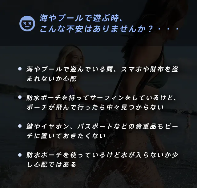 海水浴やプールで目を離しているうちに貴重品が盗まれる心配から解放されます。