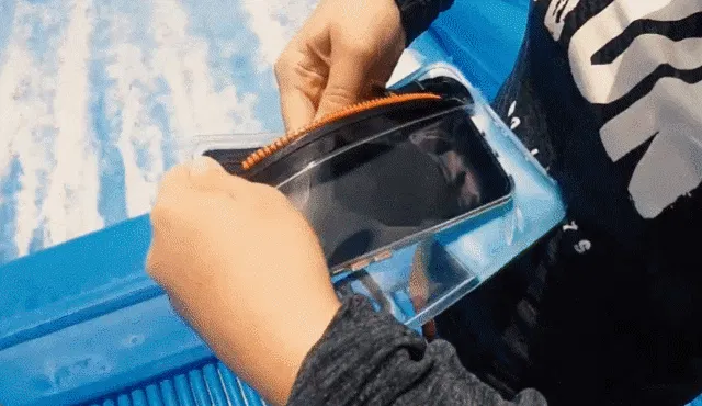 そのため水の中に沈めてもファスナーや縫製部分の隙間からが浸入せず、ポーチの中のスマホが水に濡れる心配は無用です。