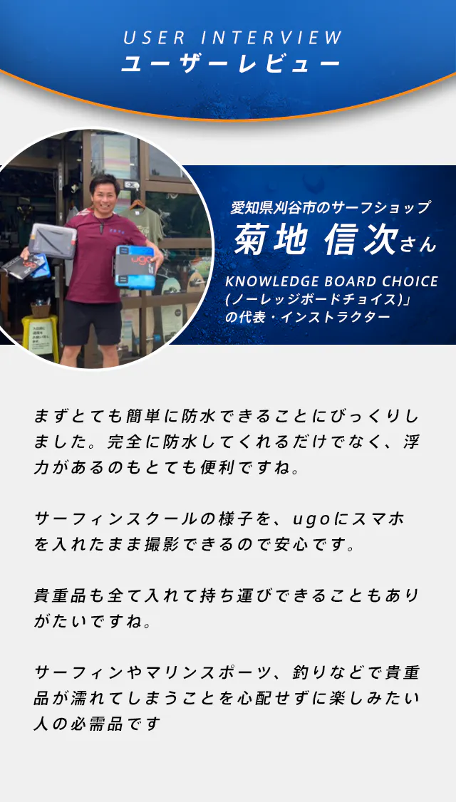 ■愛知県でサーフショップを営み、サーフィンのインストラクターとしても活躍する菊地 信次さんに【ugo PHONE2.0】を使用した感想を伺いました。