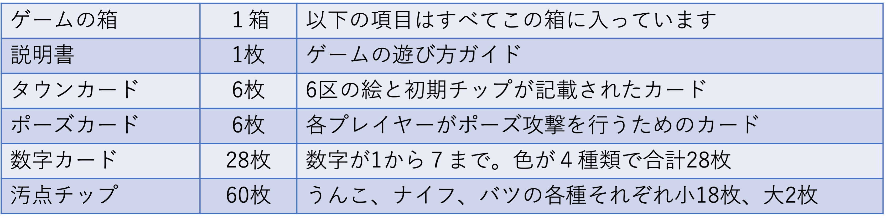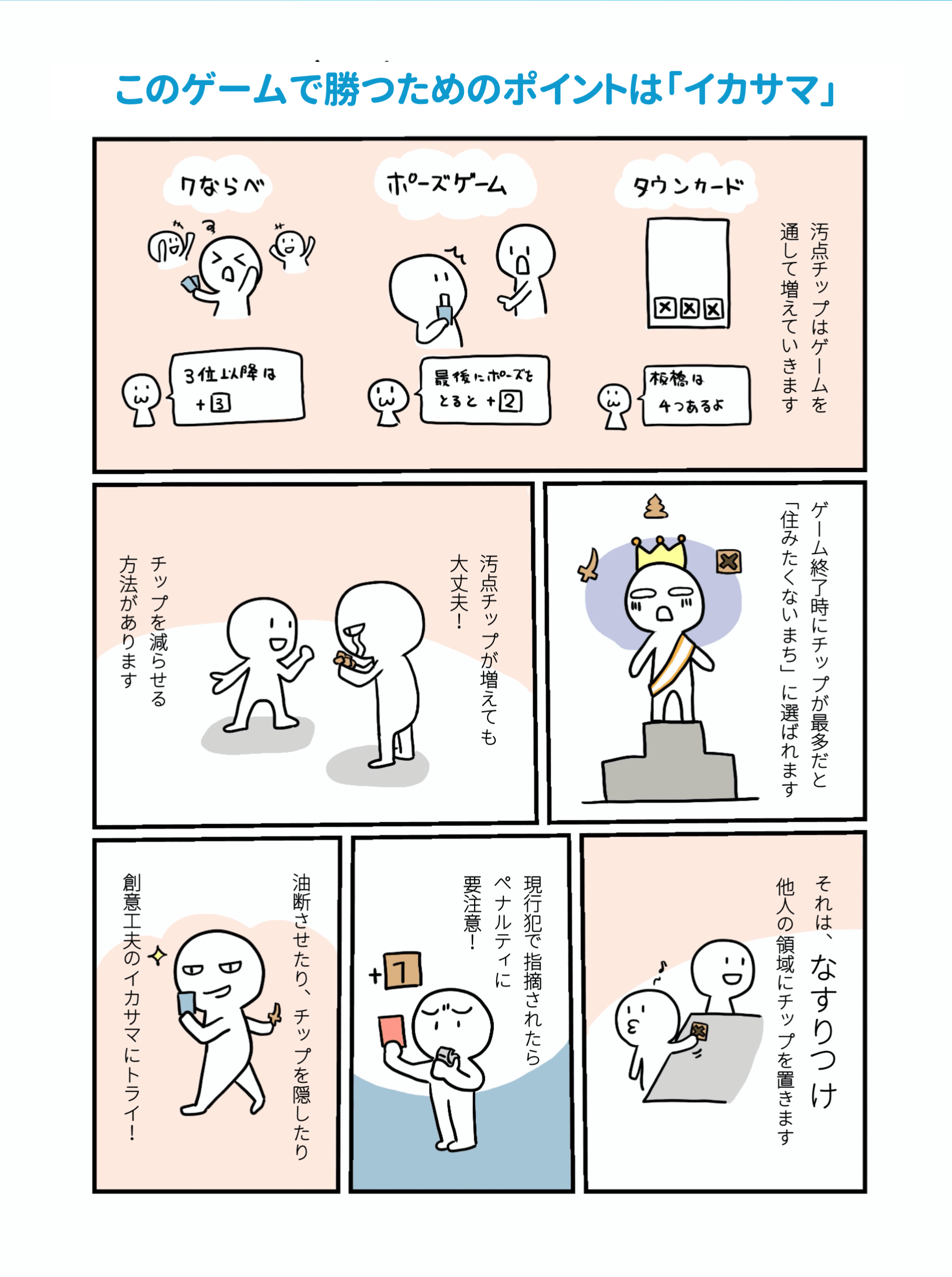 各プレイヤーはこの6区いずれかの代表となり、もっている分だけマイナス点になる「汚点チップ」をなるべく所有しないよう立ち回ります。