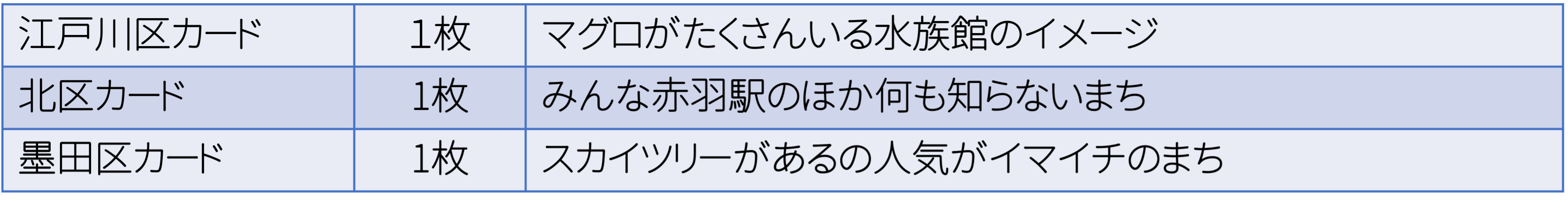 23区で「その最下位バトルに、オレたちのまちが無いのはおかしい!」という熱い声に応え、ランキング下位の常連である3区カードをつくりしました。通常のタウンカードに加えて楽しんでいただけます。