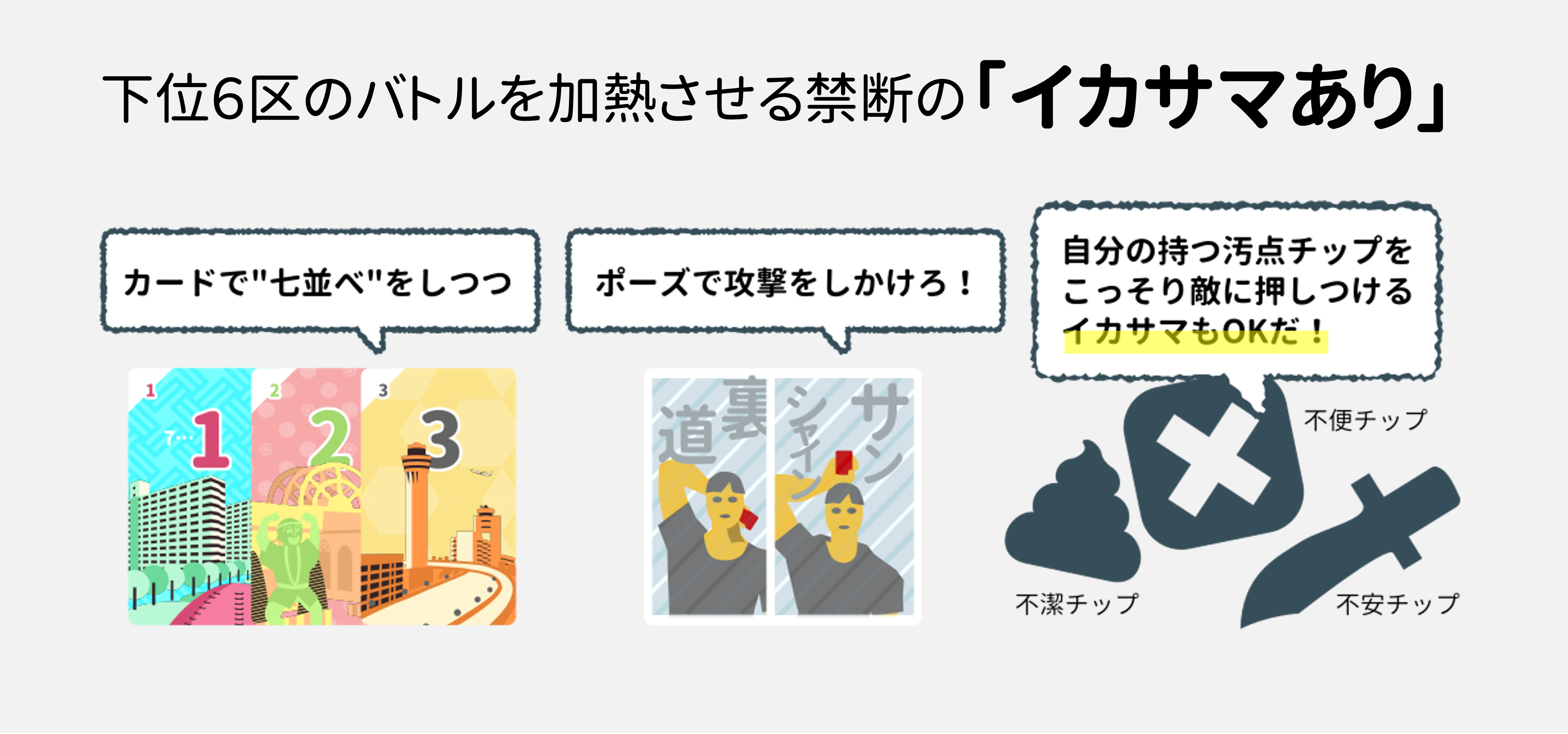 いつ、誰からイカサマされるかわからないドキドキ感。「治安が悪い○○区にみんなでナイフを押しつけよう」とか「うんこと言えば○○区」といった愛ある悪態が飛び交い、笑いながらも緊張の糸がとぎれない、濃厚なゲーム体験を味わえます。