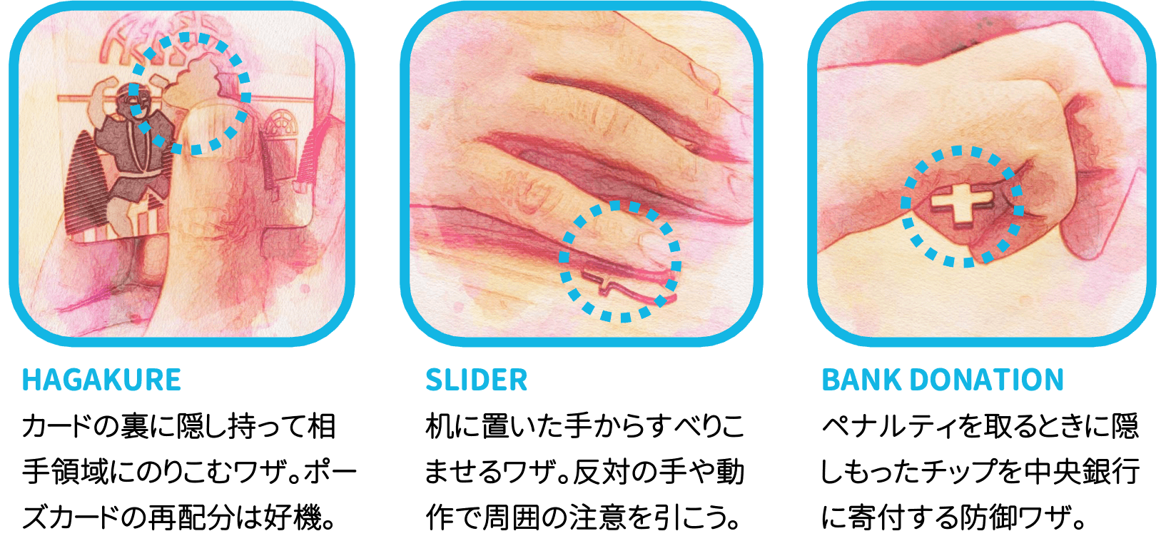 このゲームの大きな特徴は「イカサマ」の存在です。あなたが不本意にも手にしてしまった「汚点チップ」は、いつでも、他人にこっそり押しつけて渡してしまうことができます。