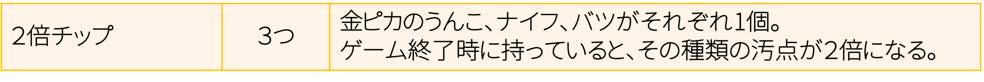 また、スペシャル汚点チップもセットで用意します。この3Dプリンターで製造したこの金ピカ汚点チップは、ゲーム終了時に所持していると、その種類の汚点チップ点数が2倍になるという特性を持っています。通常の汚点チップよりも厚みがあるため、小指の間にはさんで仕込むことも容易です。通常セットの汚点チップとあわせて自由に使ってください。