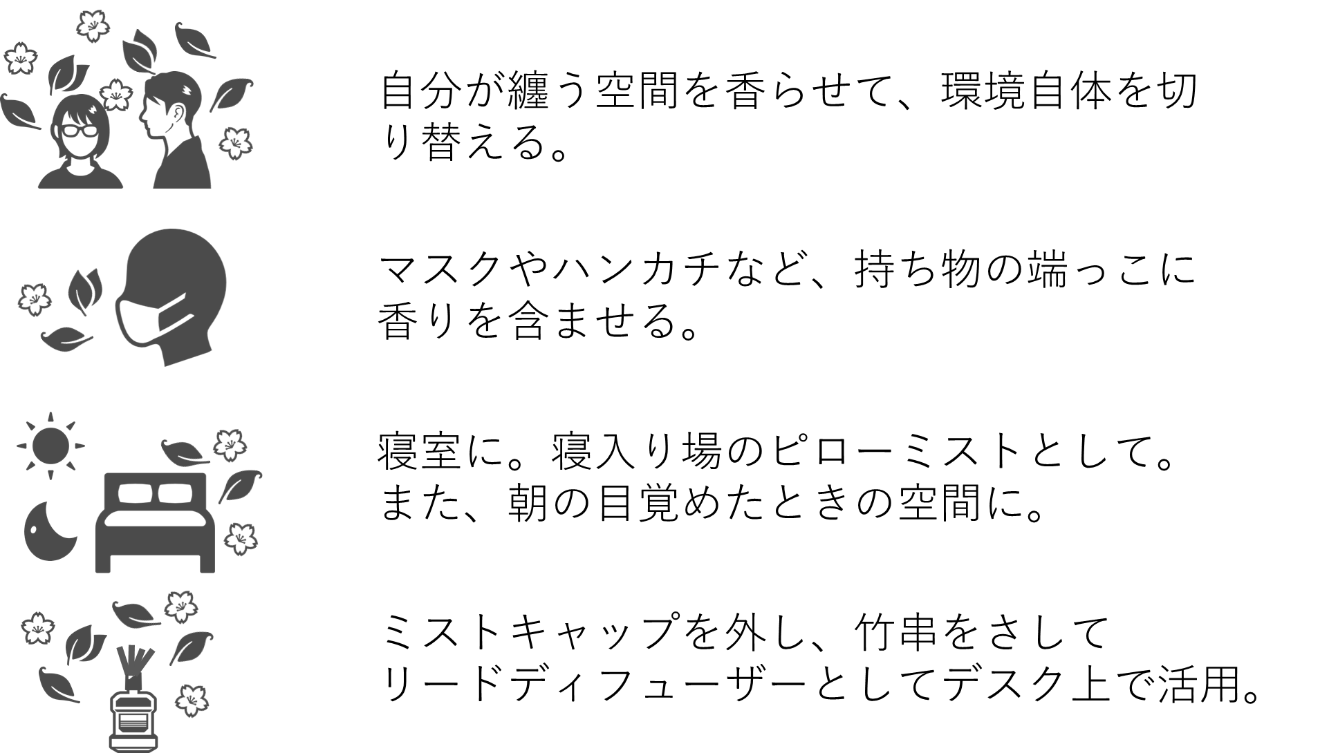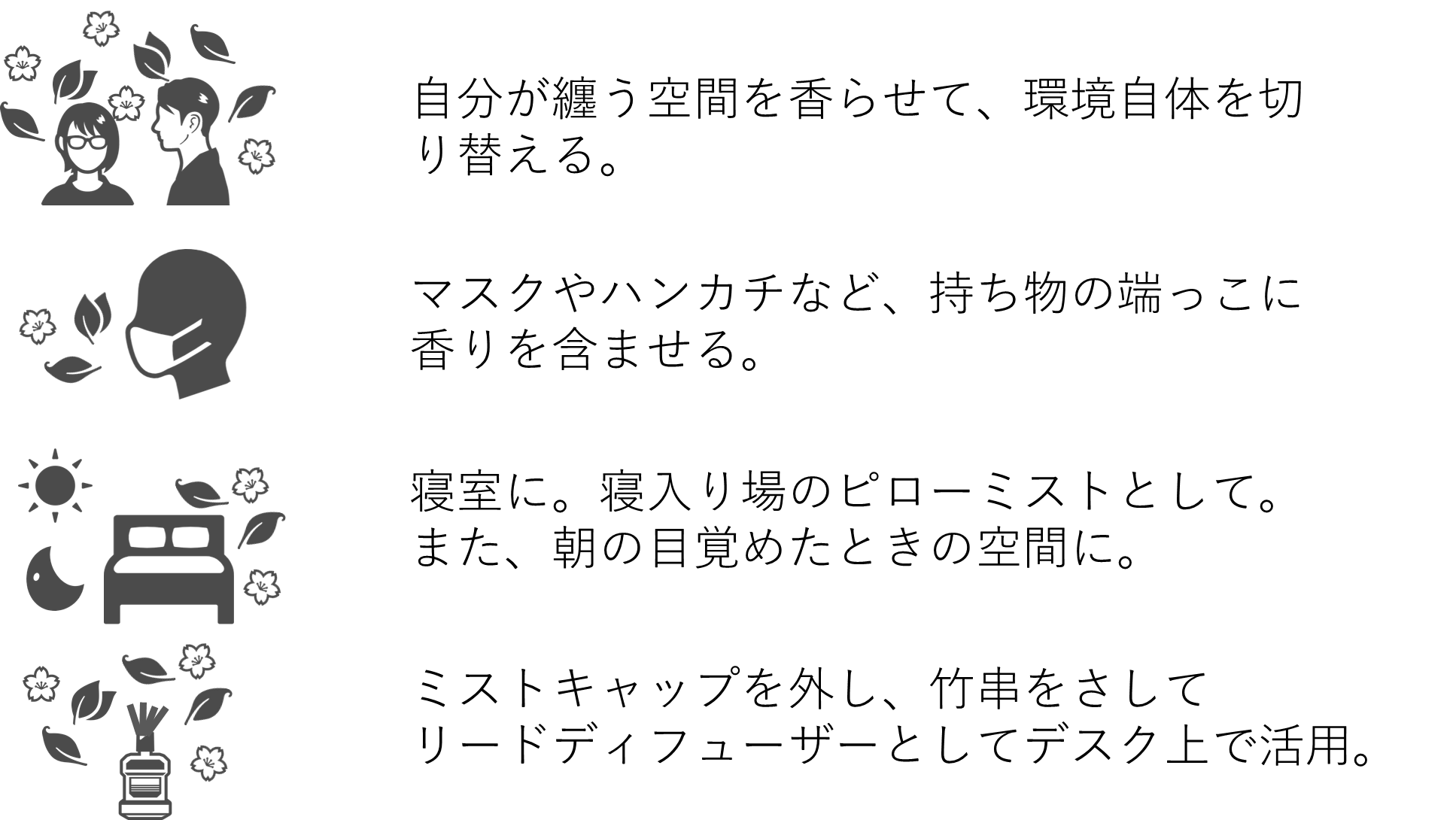 それぞれのライフスタイルに合わせて、香りの楽しみ方は沢山。アナタに合った形でご使用ください♪