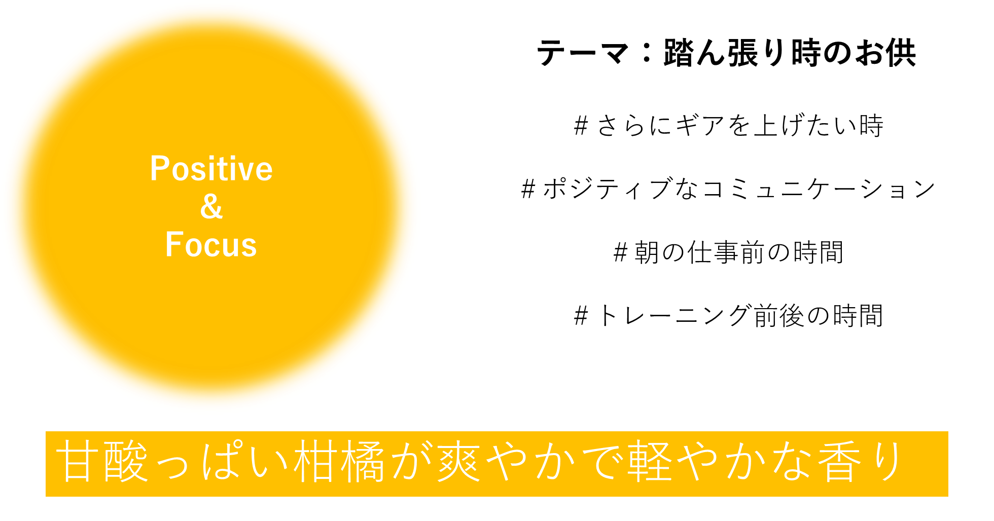 1本で多用途に活用できるのがこのフレグランスミストのいいところ。お勧めは仕事前や就業時間中はPositive & Focus やSilence & Inspiration を活用し、OFFの時間や就寝時にEasy & Cozyを活用していただくことです。さらに、ぜひその場で1回、香りを感じながら吐く息を長くする深呼吸をしてみてください。