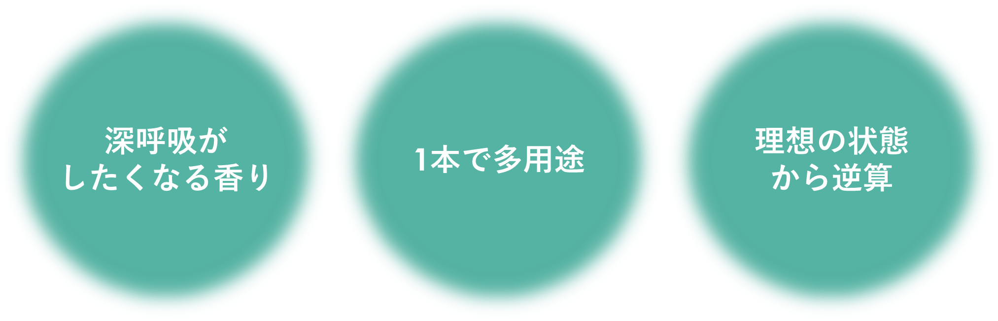 1つの香りにつき10種類〜13種類の植物性香料(精油)が使われています。それはまるで手のひらサイズの自然。思わず深呼吸がしたくなるような香りです。日常のあらゆるシーンに馴染む調香のため1本で多様な使い方ができます。香りの商品を選ぶときに「どの香りが自分にいいのかわからない」「他者からどう思われるかがわからないから、ハードルが高い」という方は多くいらっしゃいます。しかし、ここでは掲げる「理想の状態」をもとに、自分のために香りを扱うことを推奨しているので悩む必要はありません。