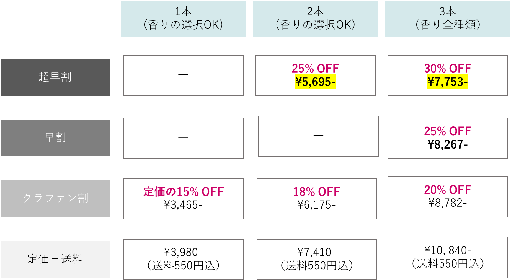 フレグランスについては、本数、香りの選択ができます。ただし、3本をお選びの方はすべての香りをお送りいたします。