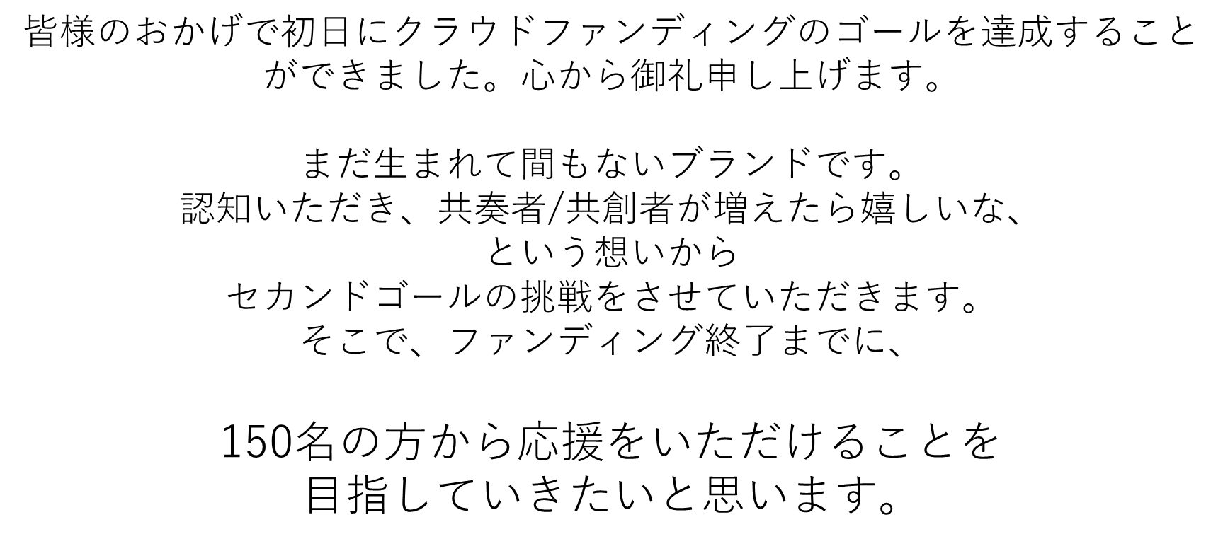 2022/11/14 21:24皆様こんにちは!月曜日はいかがお過ごしでしょうか?もう11月も中旬。あっという間に2022年も終盤ですね。お陰様で11月13日にクラウドファンディングを終え、Total 168名の方に応援いただくことができました。無名のブランドの嗅いだことも無い香りに対し、ここまで多くの方にサポートいただけるのはとてもありがたいことです。皆様の貴重なお時間と可処分時間をこのプロジェクトに割いてくださってありがとうございました。ご支援いただいた皆様が将来ドヤ顔に思わずなってしまうような、楽しく美しいブランドになっていけるように、今後も尽力していけたらと思っております。今後もぜひ見守っていただけますと幸いです。まずはリターンのお届け、頑張ります!!改めまして、この度はご支援をありがとうございました! もっと見る