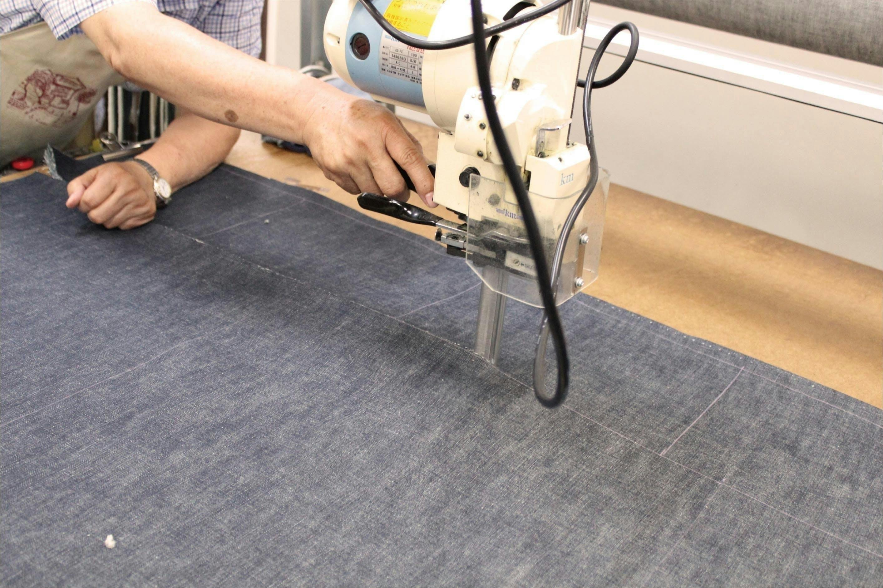 チョークで商品それぞれのサイズに線を引き、裁断機で重なった生地をカットしています。