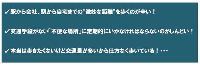普段外出することが多いあなたにはこんな「お悩み」がありませんか?“車を使うまではいかないけど歩くには気が重い「微妙な距離」を通らなければならない!”
