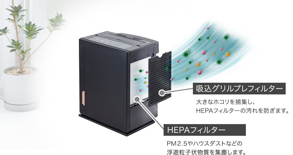 吸込グリルプレフィルター、HEPAフィルターを搭載することで、本体内部のホコリによる汚染を防ぐとともに、