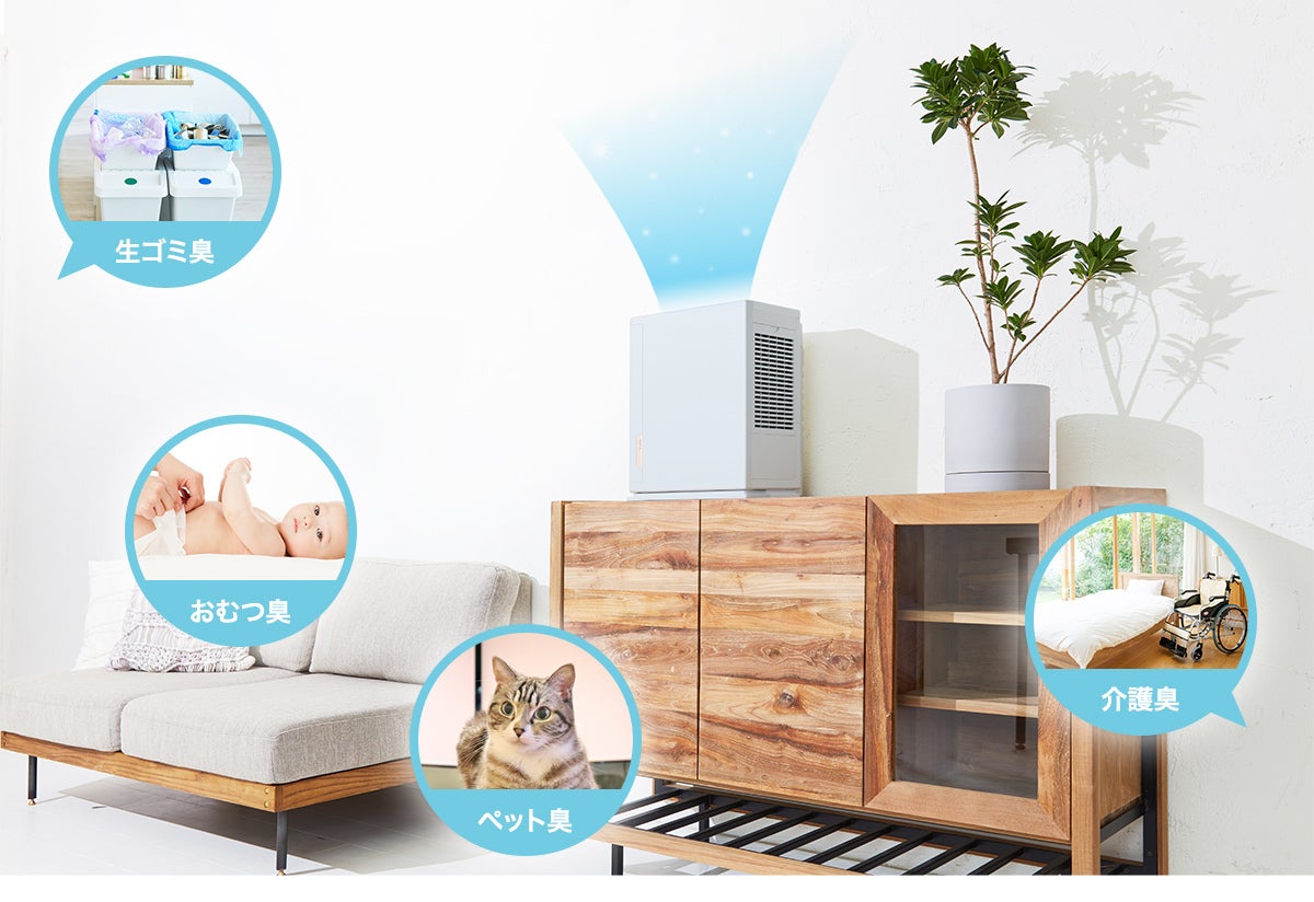 さらに除菌水フィルターを通った空気には、揮発化された極めて微量の次亜塩素酸(人体に影響がない濃度:0.025ppm未満)が含まれており、キレイになった空気と一緒に放出されることで、不快な臭いを発生するペットのトイレ、ゴミ、赤ちゃんのおむつ、介護環境でのこもった臭いなどにも効果を発揮します。