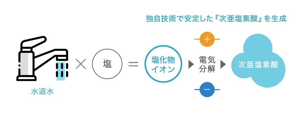 本体内部で生成する電解次亜塩素酸水を用いるため、