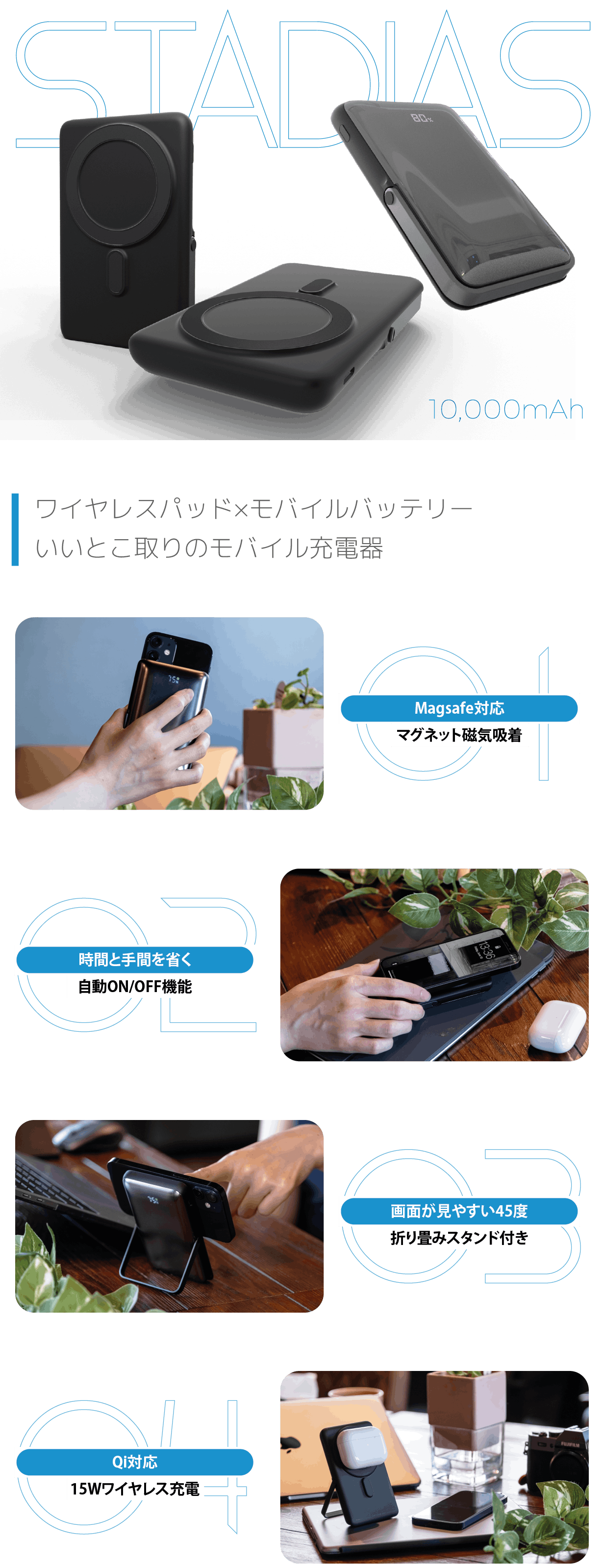 【EZO STADIAS】はスマホを近づけるだけでピタっとくっつき、ワイヤレスで即充電開始。電源ボタンを押す必要のない、モバイルバッテリーです。
