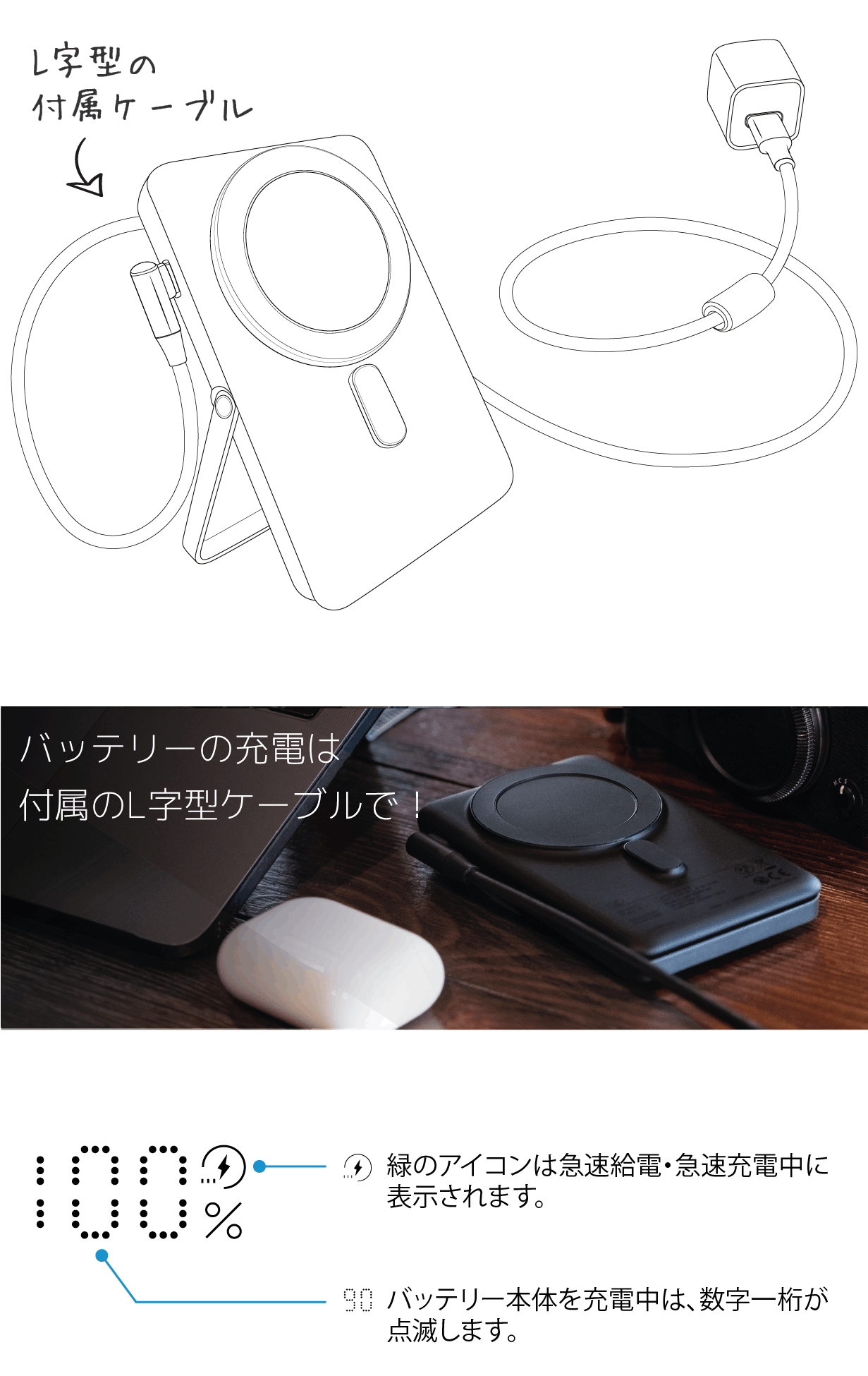 またバッテリー本体を充電時が1桁の数字が点滅、急速充電中は緑のアイコンが表示される、などその時々に合わせて表示方法が変わるのもわかりやすいですよ。
