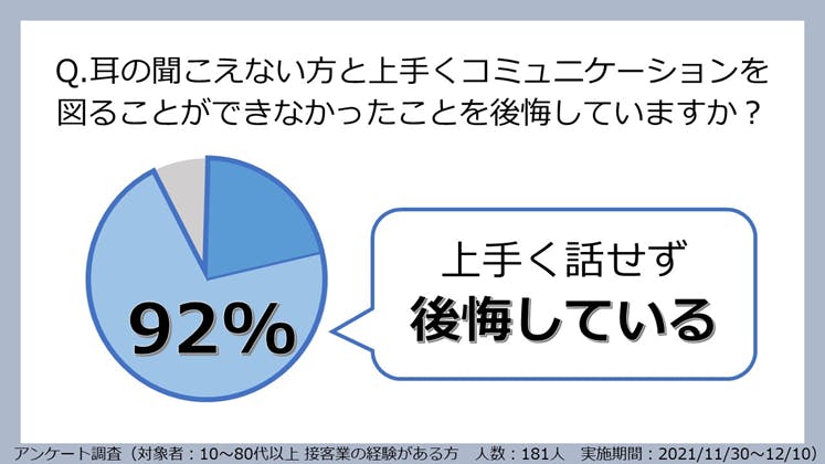 耳の聞こえない方とのコミュニケーションに困った経験がある方はいるのかを調査するため、耳の聞こえる方181名にアンケート調査を行いました。その結果、92%の方が耳の聞こえない方と上手くコミュニケーションを図ることができず後悔していることが分かりました。後悔した理由には、「事前準備をしていなかった」「マスクで表情が見えなかった」等がありました。また、職場に筆談具が常備されていると安心する方は、94%でした。