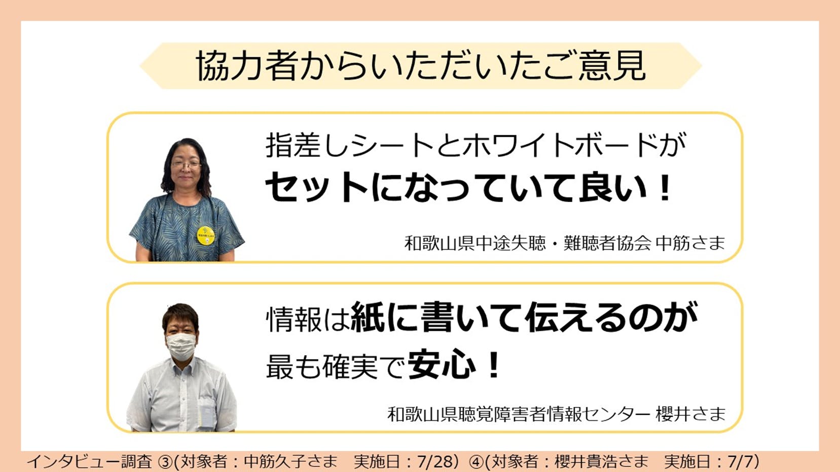 耳の聞こえない方の日々の困りごとについて理解を深めたいと考え、計23人の方へインタビューを行いました。そこで、飲食店へ行った際、間違ったメニューが来たが、伝えることを諦めた実体験や、外出先で聞きたいことを諦めてしまったことが何度もあるとお聞きし、 “コミュニケーション全般”に困っていることがわかりました。
