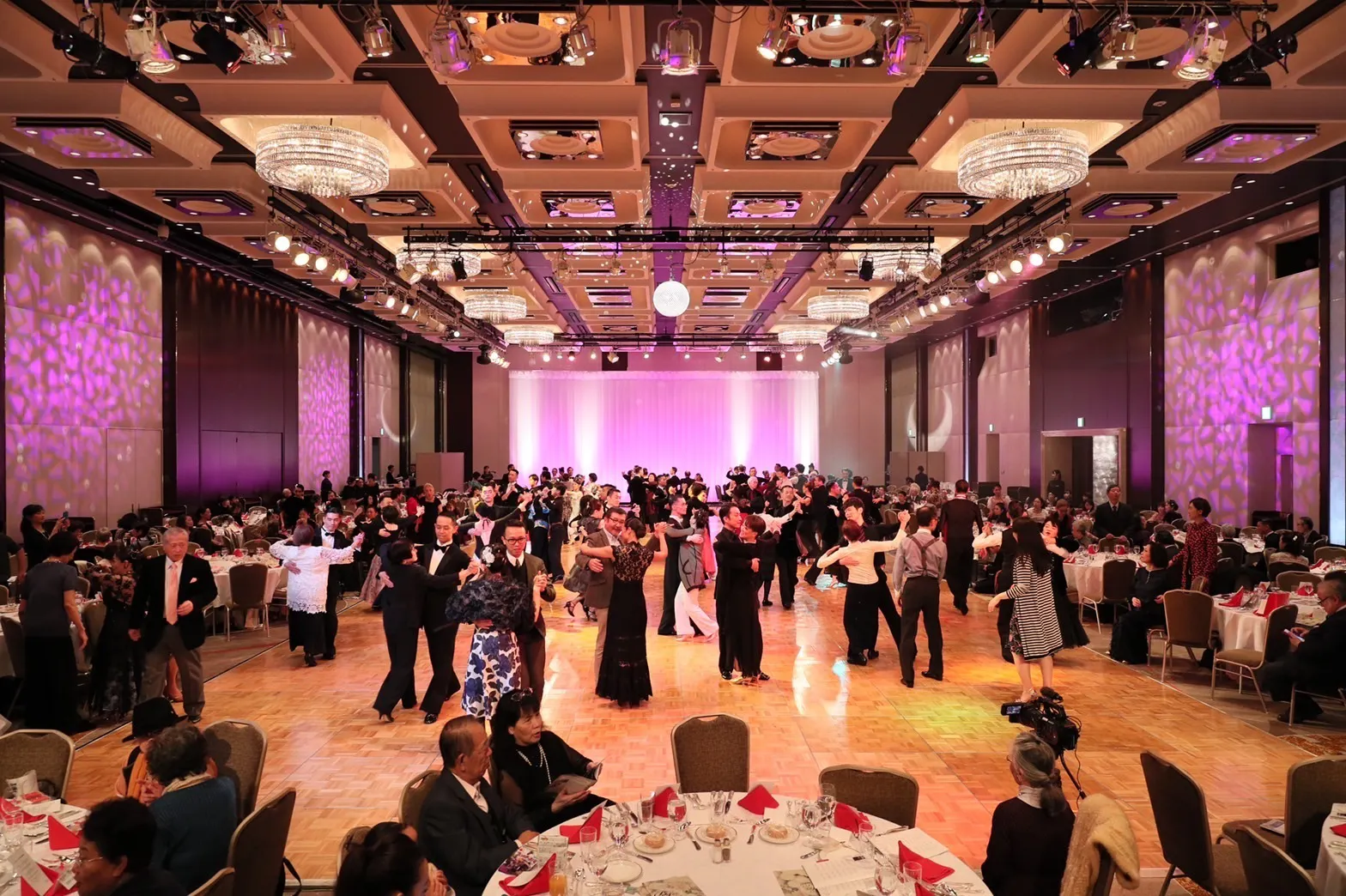 一般的に社交ダンスの競技会などは、1,2台のカメラで撮影されますが、今回は多くのプロカメラマンを配置し、できるだけたくさんの出場者の撮影をおこないます。また、社交ダンスの競技会を初めて見る方のために、ナレーターやコメンテーターなどによる解説やインタビュー撮影もおこないます。