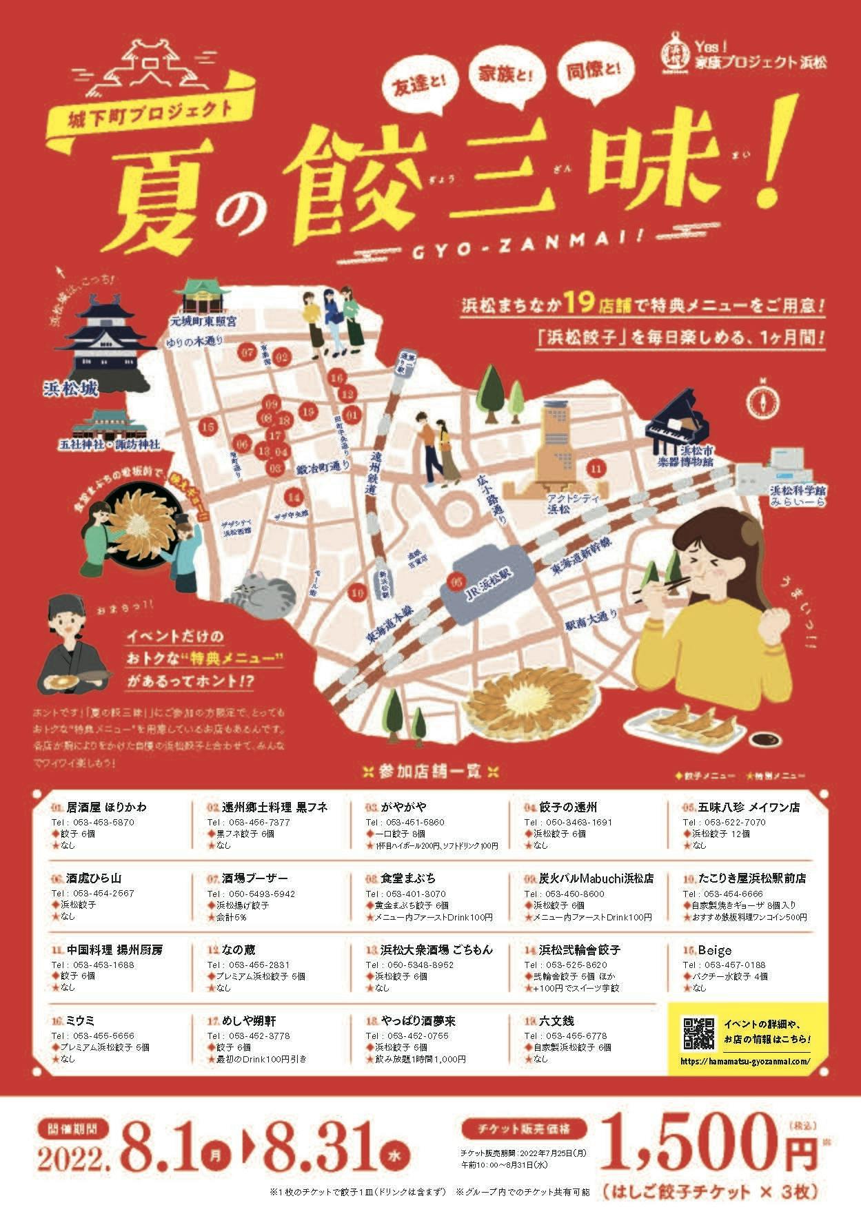 にぎわい協議会さんに掛け合って、課題だった浜松の街中の活性化するためのであるプロジェクト「餃三昧」(全18店舗が参画!)を2022年8月~で行いました。大勢の方々にご参加いただき一大イベントとなりました。