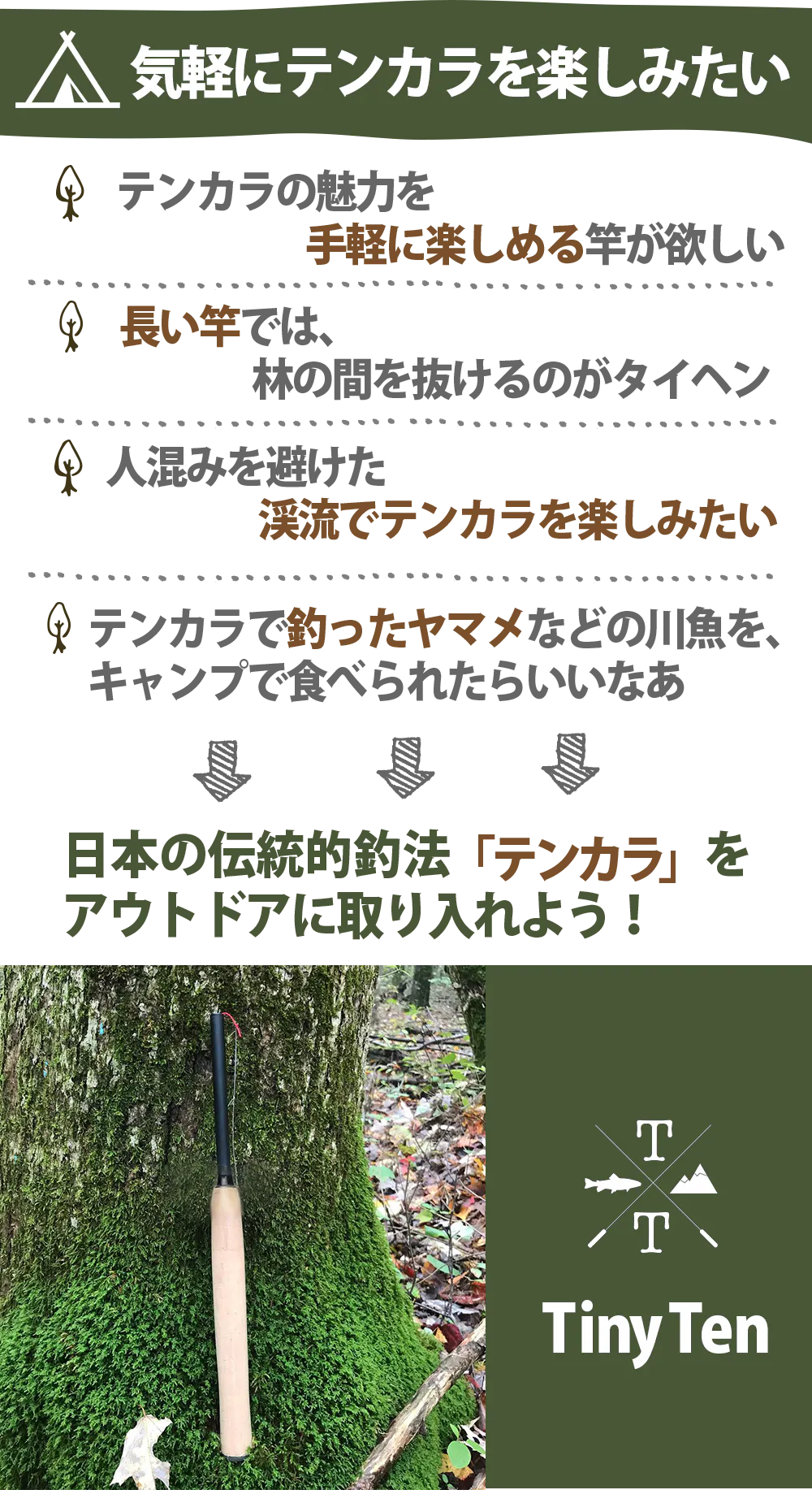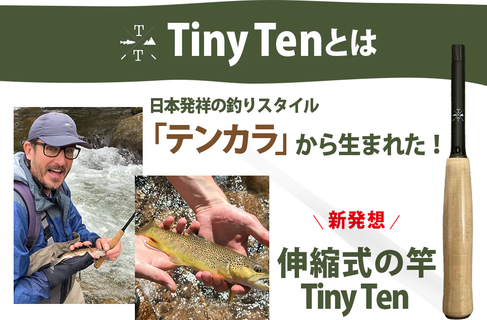 そんな中、コロラドの青年サミュエル・ケイトがTiny Tenを制作しました。日本古来の釣法「テンカラ」で使う竿が、米国でリデザインされたのです。弊社はこの商品を今後老若男女問わず多くの方々にご紹介してまいります。