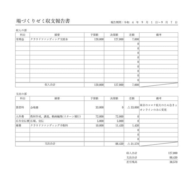 2022/09/15 09:05サポーターの皆様この度は、場づくりゼミ実施のクラウドファンディングにあたたかいご支援をいただき誠にありがとうございました。今回、場づくりゼミ直前に東京でコロナ感染者数増加を受け急きょオンラインのみに変更した関係で会場代の余剰金がありましたのでご報告させていただきます。余剰金は38,570円でした。こちらは、今後奥村の活動を支援してくださっているサポーターの方々との共同企画の実施費用として活用いたします。皆さまのあたたかいご支援で場づくりゼミが無事に開催できました。本当にありがとうございました。場づくりゼミ 奥村安莉沙【収支報告】 もっと見る