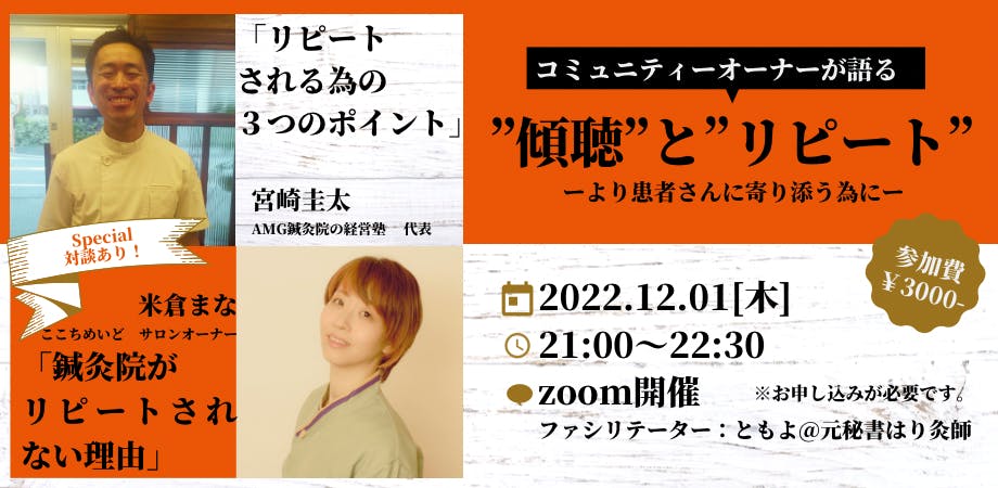 鍼灸師向けセミナー「傾聴とリピート」開催のお知らせ【12月1日(木)21時〜】