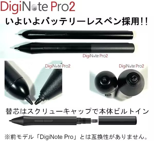 A.「DigiNote Pro」と「DigiNote Pro2」それぞれの専用ペンは互換性がなくお使いいただけません。 タブレット画面は筆圧を感知しますので、画面上に描くことは出来ますが、アプリやパソコンとの連動が出来ないということになります。